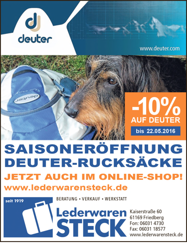 Eine große Auswahl an Rucksäcken, Taschen und Accessoires von Deuter gibt’s jetzt auch in unserem Online Shop – bequem, schnell und versandkostenfrei – unter www.lederwarensteck.de