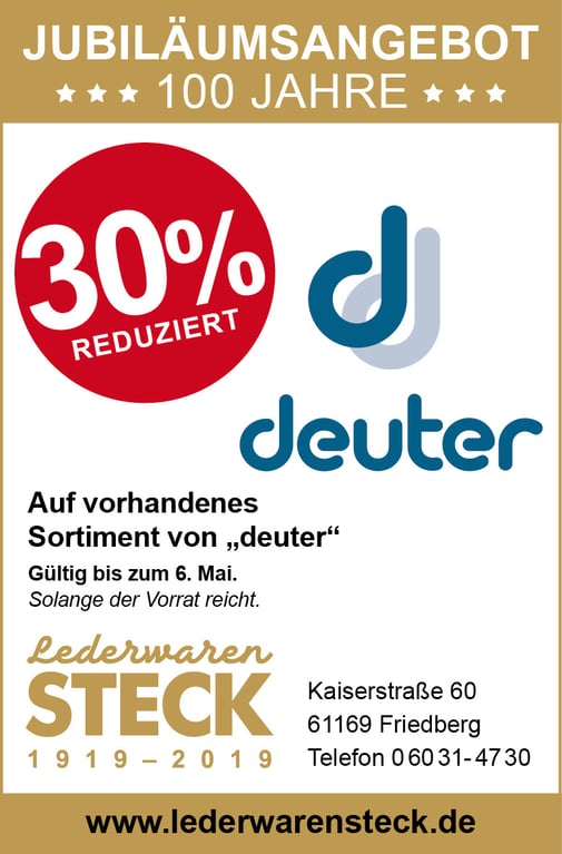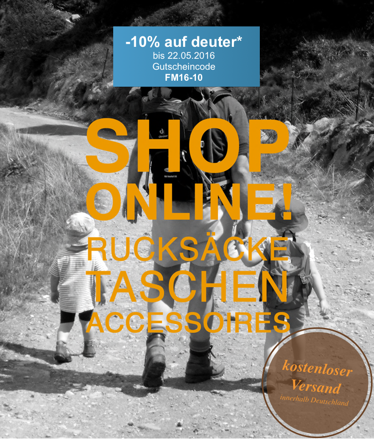 *Deuter Rucksack, Tasche und Accessoire -10% Rabatt bis 31.05.2017 in unserem Online-Shop bei einem Mindestbestellwert von 50,– Euro. Gutscheincode FM17-10 im Warenkorb angeben.