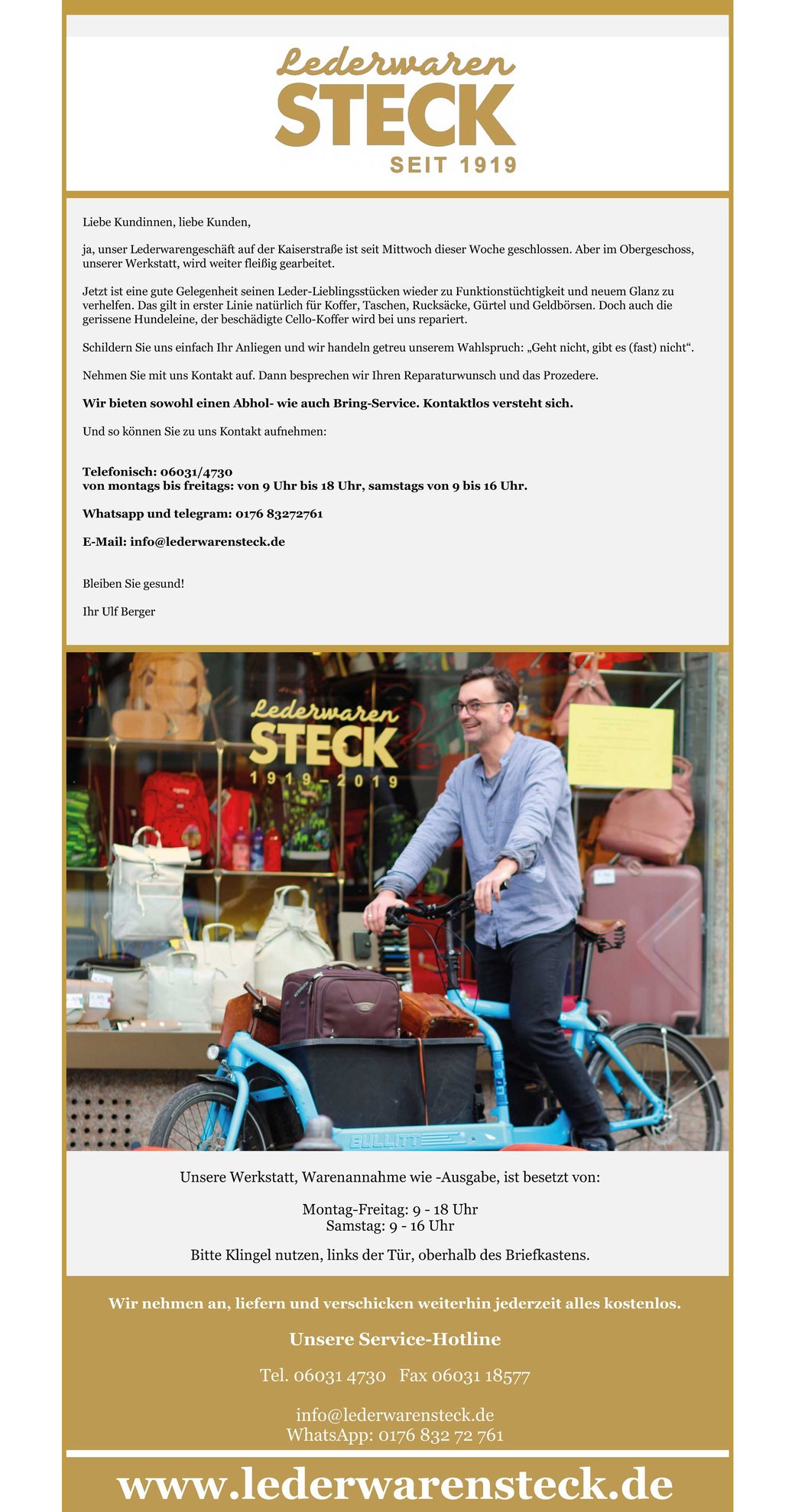 Jetzt kommt der „Notfallarzt“ für Koffer und andere Katastrophen, Ulf Berger, ins Spiel. Wer die Privatnummer des Inhabers des Lederwarenfachgeschäfts Steck hat, dem wird auch am Sonntag geholfen und wenn es nicht anders geht, kommt der Herr der Koffer und Taschen auch direkt nach Hause. Das ist ohnehin ein selbstverständlicher Service des Traditionsunternehmens Steck auf der Kaiserstraße. „Auf Wunsch liefern wir nach Hause, frei Haus, versteht sich“, schmunzelt Ulf Berger und man kann es sich bildlich vorstellen, wie er mit einem charmanten Lächeln mit dem Reisegepäck vor der Tür steht.
