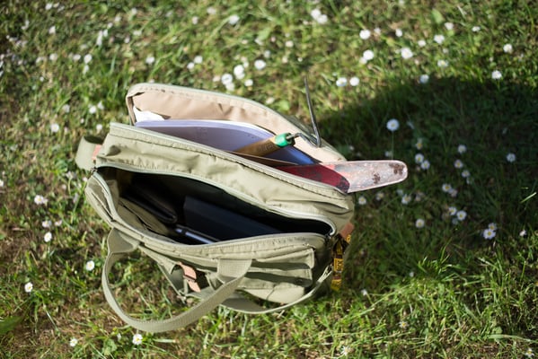 Die Tasche verfügt über ein großes per Reißverschluss zu schließendes Hauptfach mit einer Sicherheitstasche und Fächern für Handy, Ladegerät, Stifte usw.