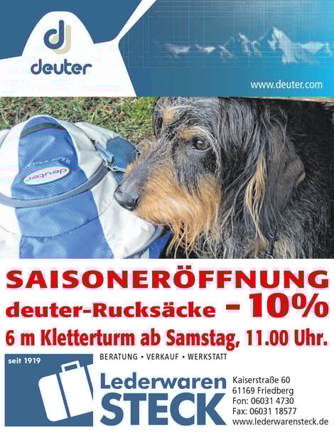 Dies nehmen wir zum Anlass die DEUTER- Saison zu eröffnen. DEUTER, der Augsburger Rucksack-Spezialist und Lederwaren STECK stellen an diesem Wochenende die neuesten Mode-Trends von Schul-, Bike-